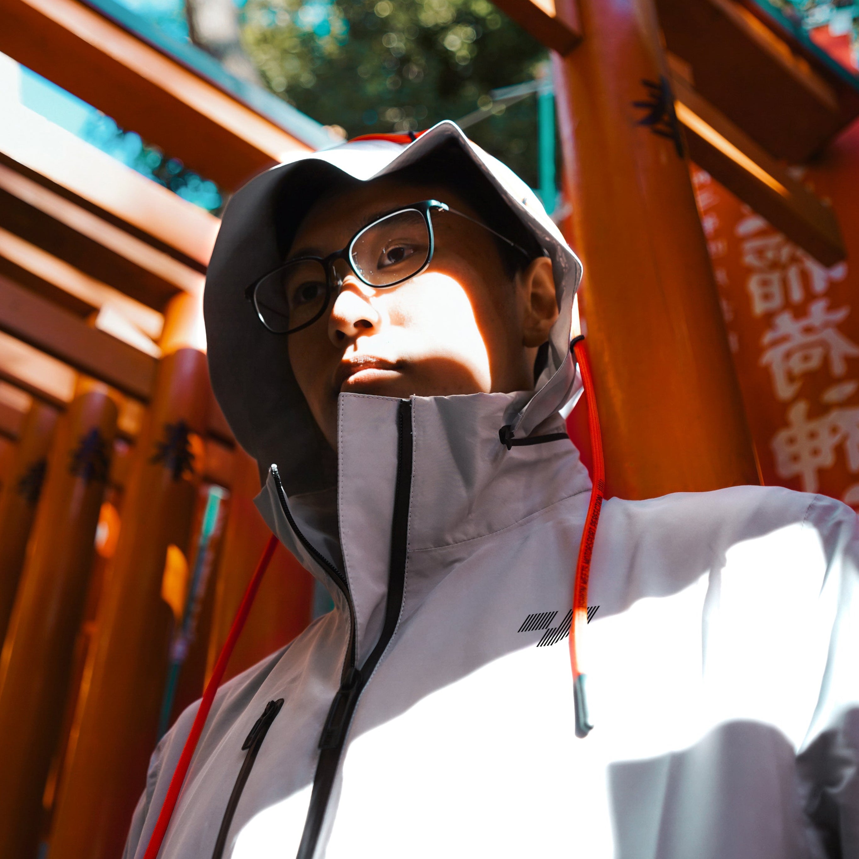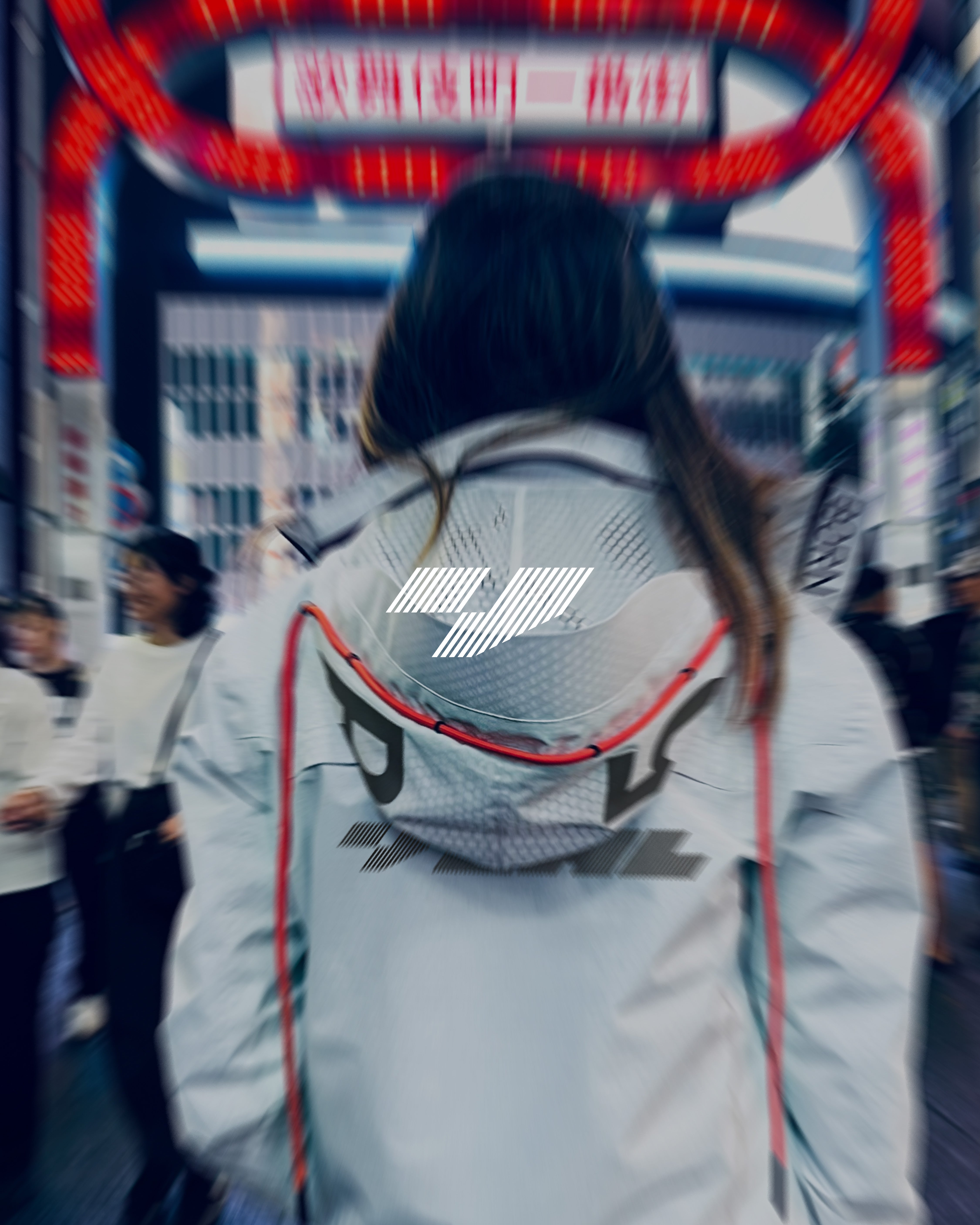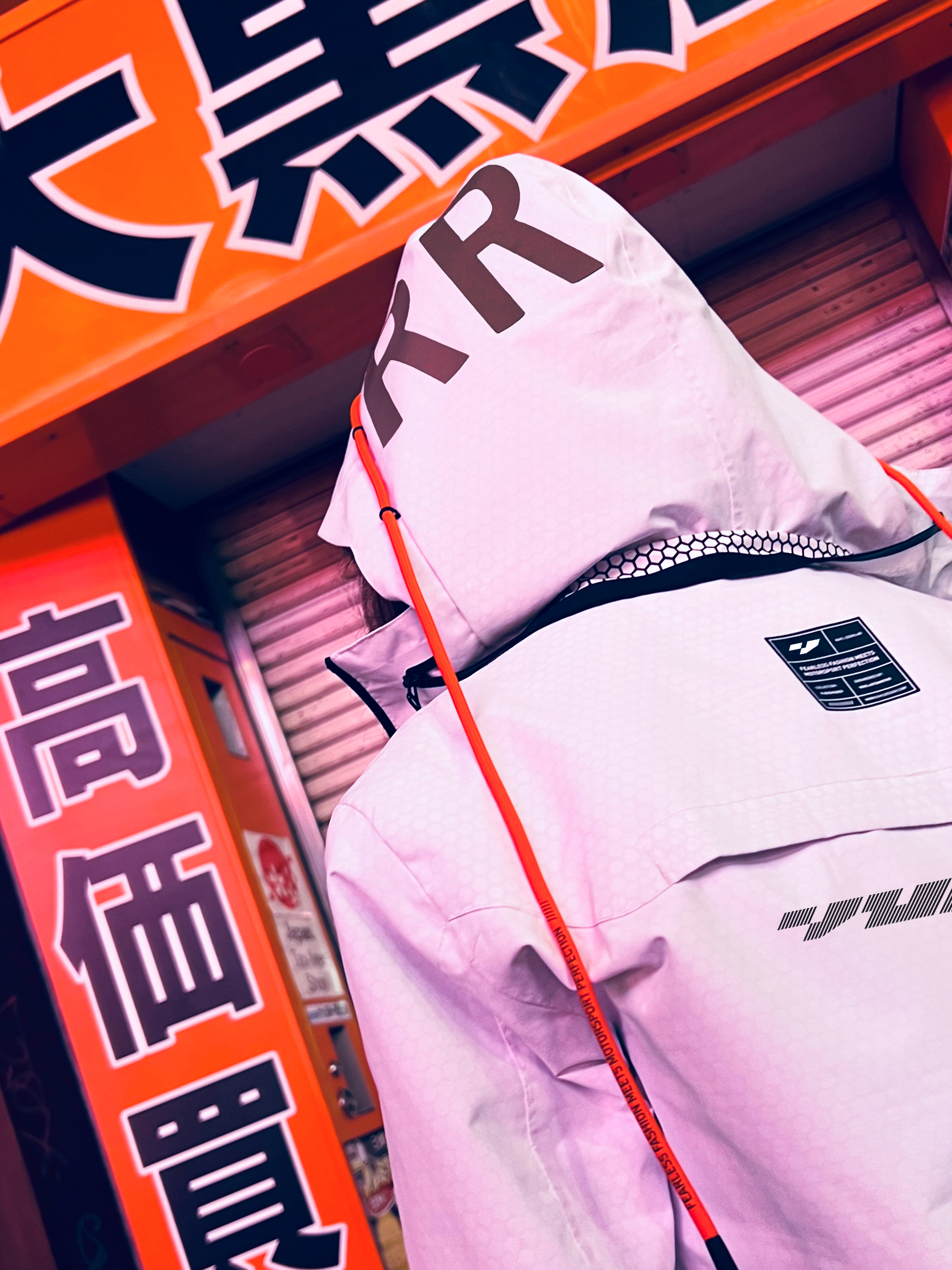 Chamarra rompevientos impermeable con logos en color negro y cordones neon red.